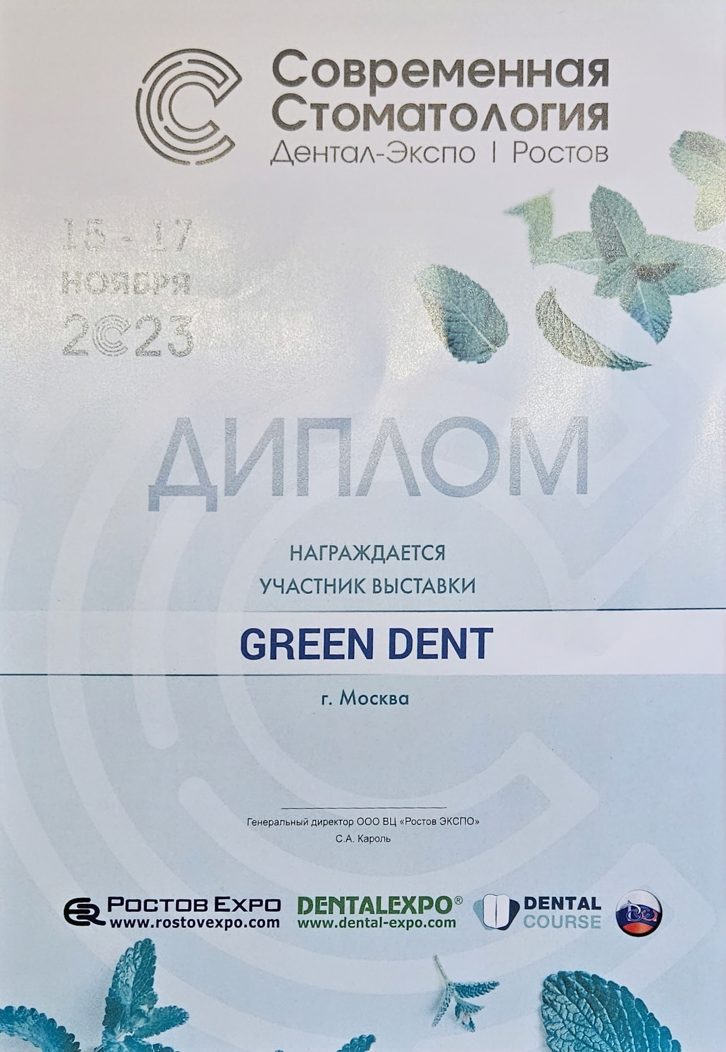 Организаторы настоящим удостоверяют, что компания GREEN DENT являлась участником международной выставки «Дентал-Экспо Санкт-Петербург»