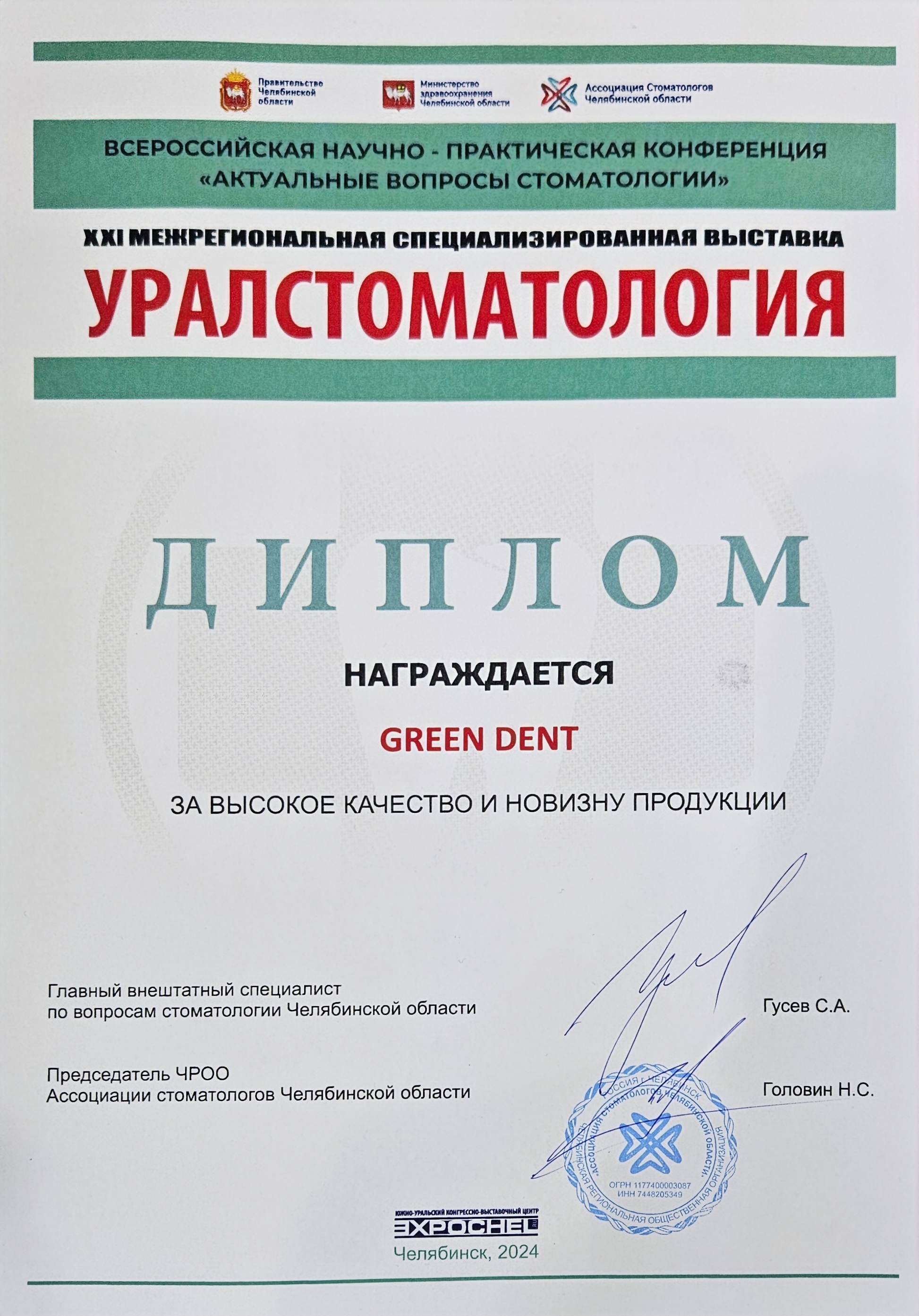 Диплом GREEN DENT за высокое качество и новизну продукции