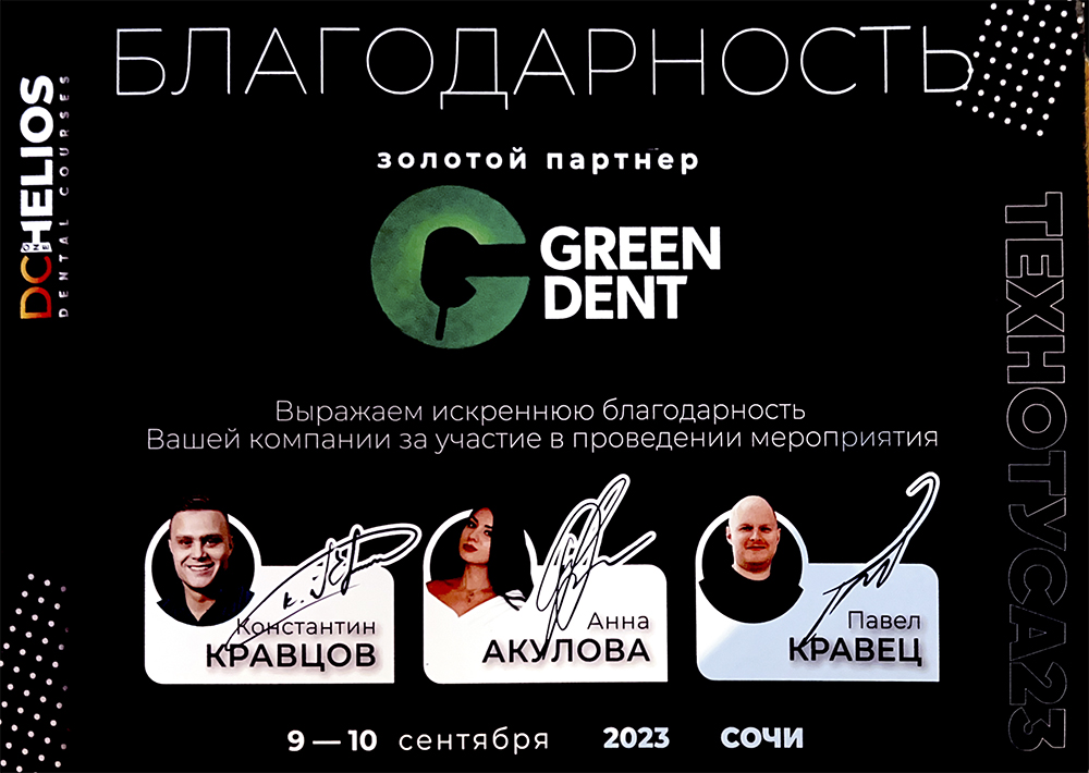 Благодарность золотому партнёру, компании GREEN DENT за участие в проведении мероприятия ТЕХНОТУСА23